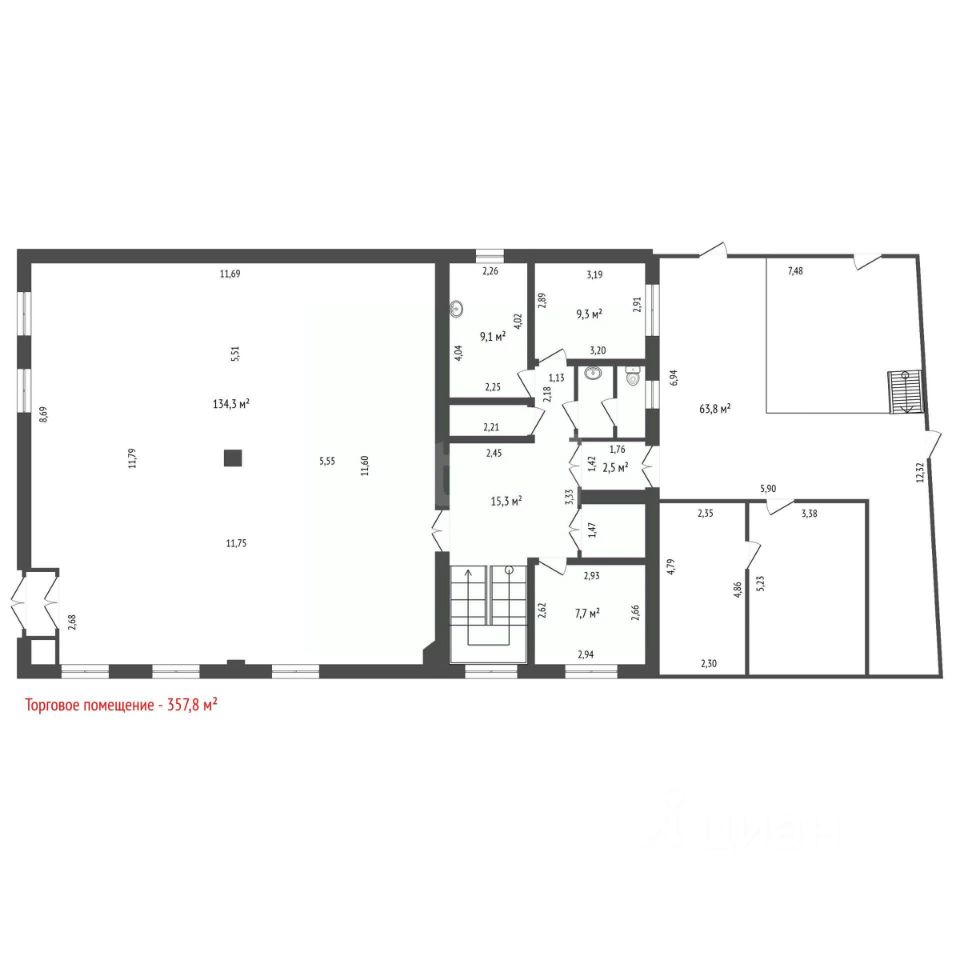 Основное пространство первого этажа занимает торговый зал площадью 135 кв.м. с высокими потолками 4,5 метра, что создает идеальные условия для организации розничной торговли, шоу-рума или офиса открытого типа.