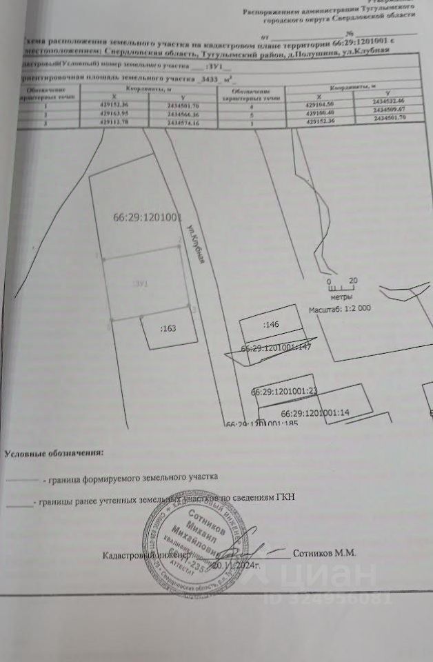 Земельный участок, кадастровый номер 66:29:1201001:309, площадью 3433,0 кв. м., расположенный по адресу: РФ, Свердловская область, Тугулымский муниципальный округ, д. Полушина, ул. Клубная, категория земель: земли населенных пунктов; вид разрешенного использования: для ведения личного подсобного хозяйства (приусадебный земельный участок).