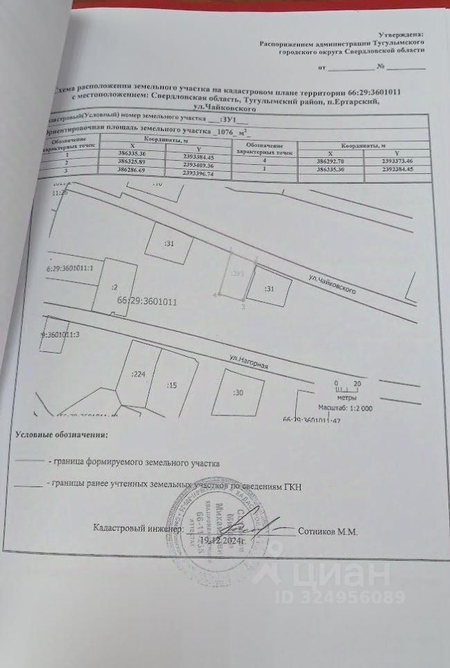 Земельный участок, кадастровый номер 66:29:3601011:393, площадью 1076,0 кв. м., расположенный по адресу: РФ, Свердловская область, Тугулымский муниципальный округ, п. Ертарский, ул. Чайковского, категория земель: земли населенных пунктов; вид разрешенного использования: для индивидуального жилищного строительства.
