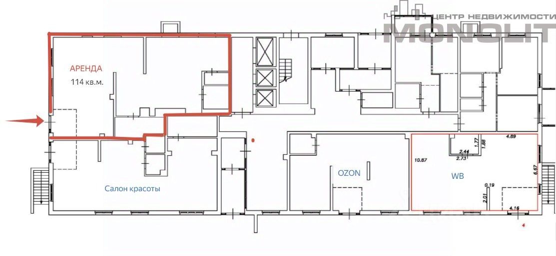 Соседние помещения занимают: продовольственный магазин Магнит, интернет-магазины OZON и WB, салон красоты.