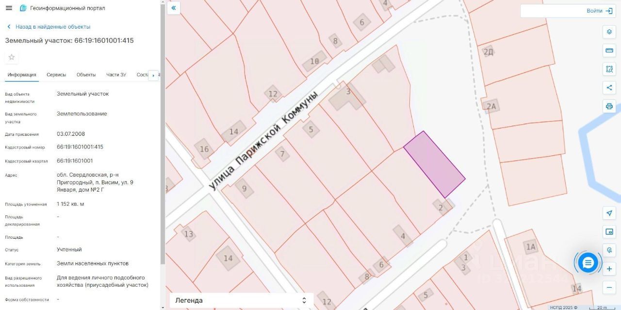 Местоположение земельного участка Свердловская область, Пригородный район, поселок Висим, улица 9 Января, дом 2 Г. • площадь 1152 кв.м • кадастровый номер 66:19:1601001:415; • категория земель земли населенных пунктов; • вид разрешенного использования для ведения личного подсобного хозяйства (приусадебный участок); • цель использования земельного участка для ведения личного подсобного хозяйства; • обременения нет; • ограничения в использовании земельный участок расположен в особо охраняемой природной территории "Природный парк "Река Чусовая", согласно Постановлению правительства Свердловской области от 17.06.2004 519-ПП, в зоне умеренного и сильного подтопления, затопления 1% обеспеченности территории муниципального округа Горноуральский Свердловской области р. Межевая Утка (ст. 67.1.Водного кодекса Российской Федерации от 03.06.2006 74-ФЗ). Государственная собственность земельного участка не разграничена.