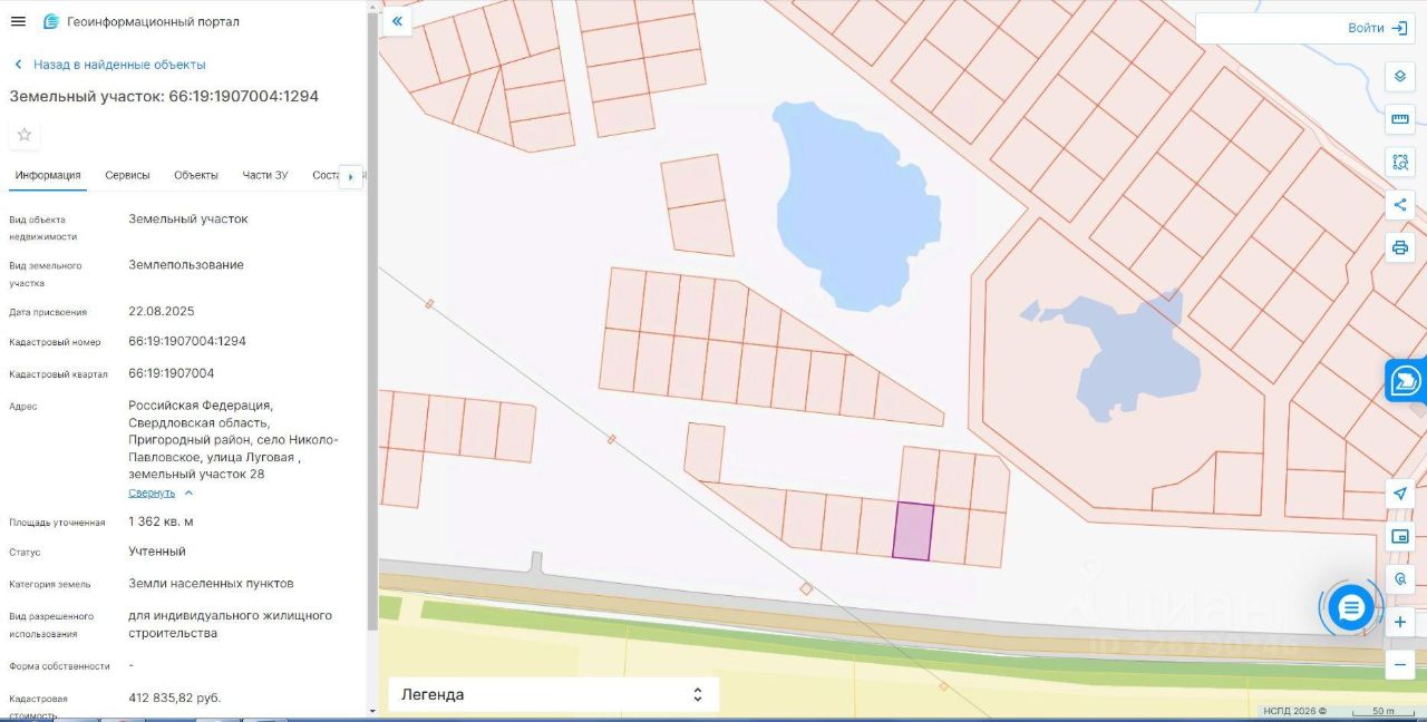 местоположение земельного участка Российская Федерация, Свердловская область, муниципальный округ Горноуральский, село Николо-Павловское, улица Луговая, земельный участок 28. • площадь 1362 кв.м. • кадастровый номер 66:19:1907004:1294; • категория земель земли населенных пунктов; • вид разрешенного использования для индивидуального жилищного строительства; • цель использования земельного участка для индивидуального жилищного строительства; • обременения нет; • ограничения в использовании нет. Государственная собственность земельного участка не разграничена.