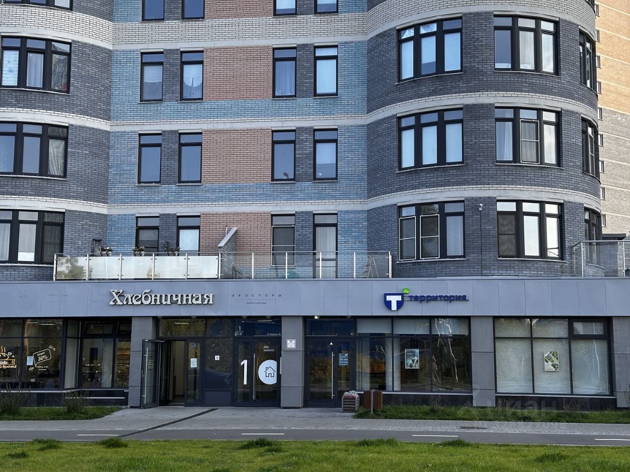 Благоустроенная прилегающая территория: лавочки, газон, современное мощение.
