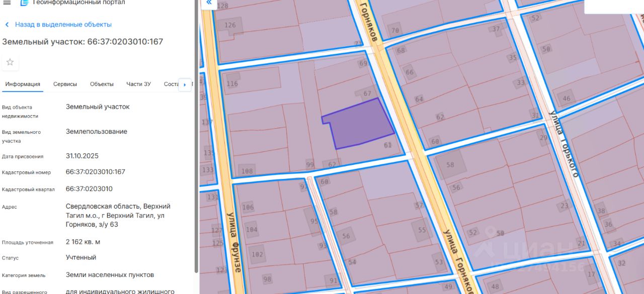 Земельный участок с кадастровым номером 66:37:0203010:167, общей площадью 2162 кв.м., категория земель земли населенных пунктов, с разрешенным использованием для индивидуального жилищного строительства, расположенный по адресу: Свердловская область, Верхний Тагил м.о., г Верхний Тагил, ул Горняков, з/у 63