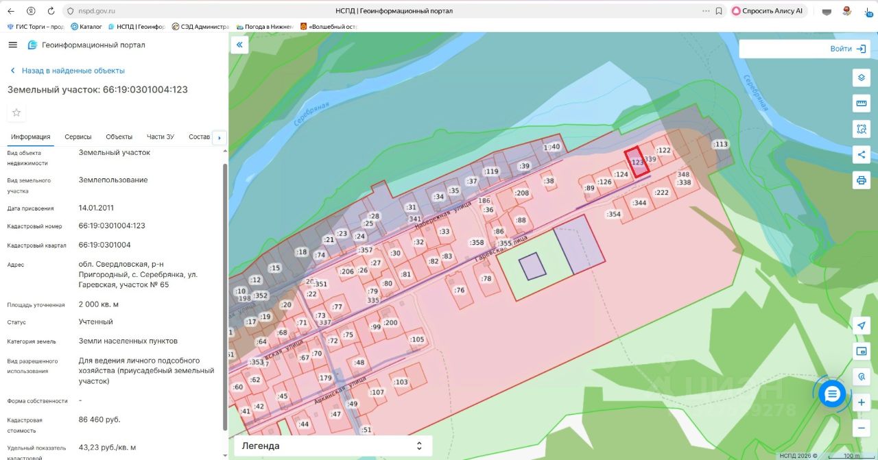 Лот 4. Земельный участок для ведения личного подсобного хозяйства. Категория земель земли населенных пунктов. Кадастровый номер 66:19:0301004:123. Местоположение: Свердловская область, Пригородный район, село Серебрянка, улица Гаревская, участок 65. Площадь земельного участка 2000 кв. метров. Разрешенное использование земельного участка для ведения личного подсобного хозяйства (приусадебный земельный участок). Срок аренды земельного участка 20 лет. Начальная цена (ежегодный размер арендной платы) 8 646 (восемь тысяч шестьсот сорок шесть) рублей. "Шаг аукциона" 400 (четыреста) рублей. Размер задатка 1 700 (одна тысяча семьсот) рублей