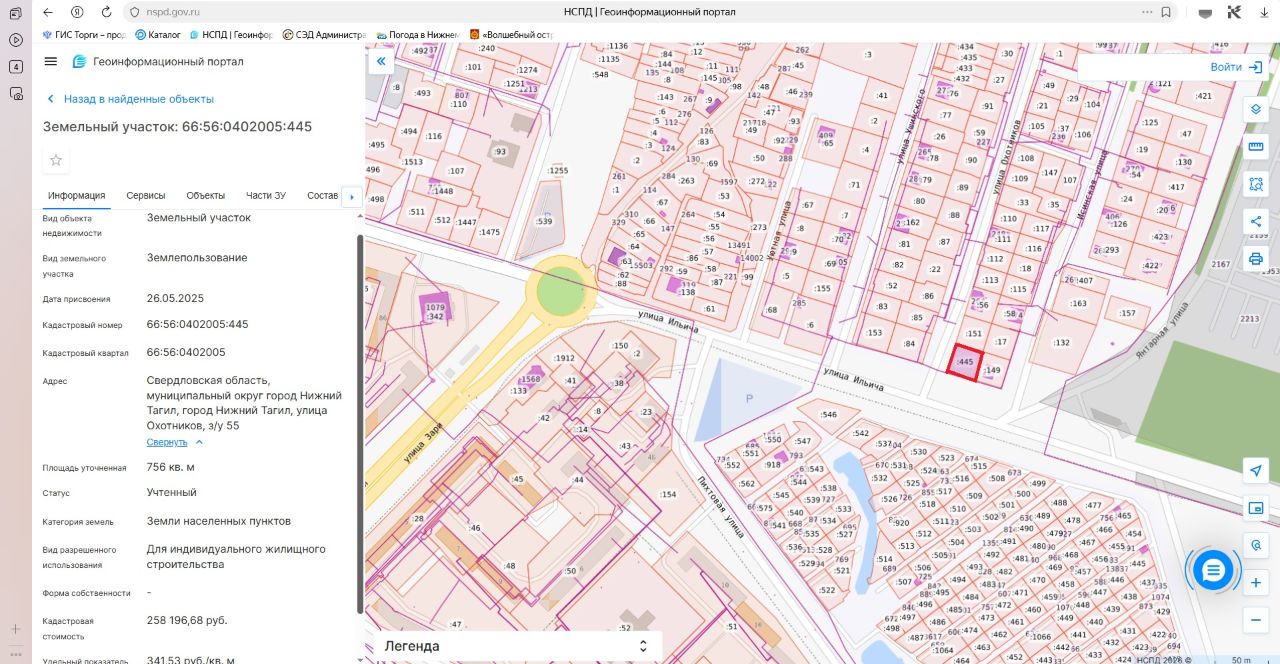 Лот 1. Земельный участок для индивидуального жилищного строительства. Категория земель земли населенных пунктов. Кадастровый номер 66:56:0402005:445. Местоположение: Свердловская область, муниципальный округ город Нижний Тагил, город Нижний Тагил, улица Охотников, з/у 55. Площадь земельного участка 756 кв. метров. Разрешенное использование земельного участка для индивидуального жилищного строительства. Срок аренды земельного участка 20 лет. Начальная цена (ежегодный размер арендной платы) 25 820 (двадцать пять тысяч восемьсот двадцать) рублей. "Шаг аукциона" 1 200 (одна тысяча двести) рублей. Размер задатка 5 200 (пять тысяч двести) рублей