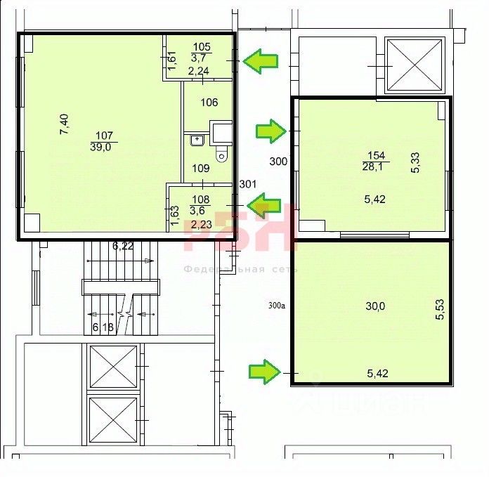 - состоит из трех кабинетов общей прлощадью 109, 6 кв. м: 51, 5 кв. м (с окнами), 30 кв. м (без окон), 28, 1 кв. м (без окон);
