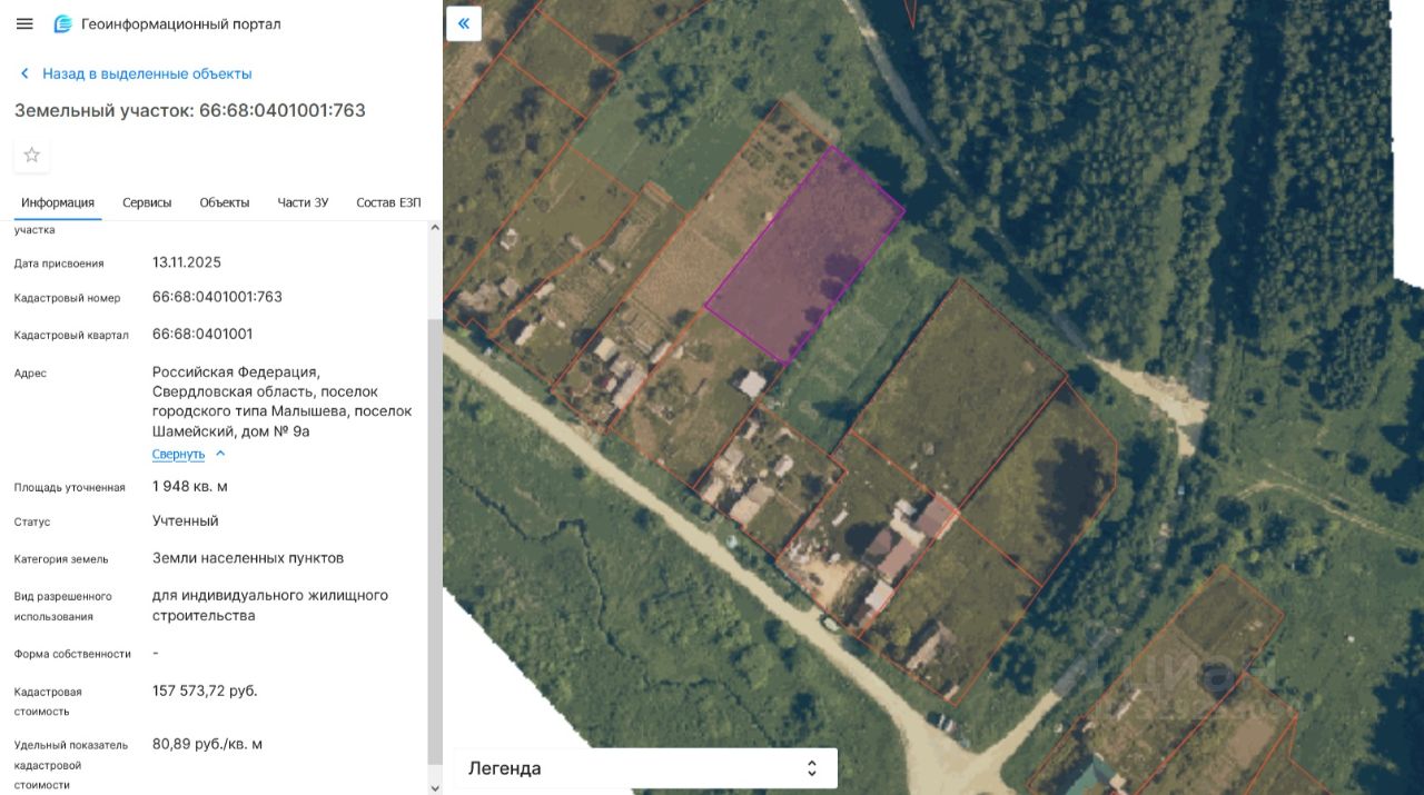 Земельный участок с кадастровым номером 66:68:0401001:763, площадь 1948,0 кв.м., разрешенное использование: для индивидуального жилищного строительства, категория земель земли населенных пунктов, местоположение: Свердловская область, пгт. Малышева, п. Шамейский, д. 9а