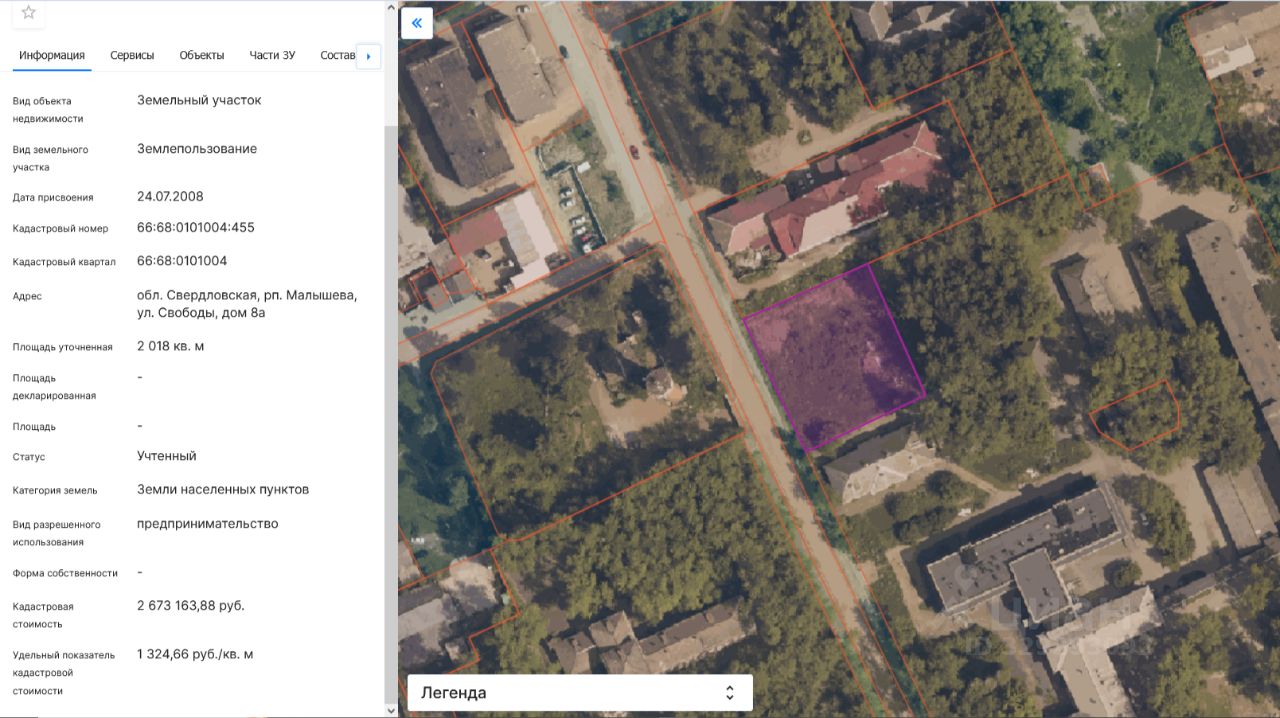Земельный участок с кадастровым номером 66:68:0101004:455, площадь 2018,0 кв.м., разрешенное использование: предпринимательство, категория земель земли населенных пунктов, местоположение: Свердловская область, пгт. Малышева, ул. Свободы, д. 8а