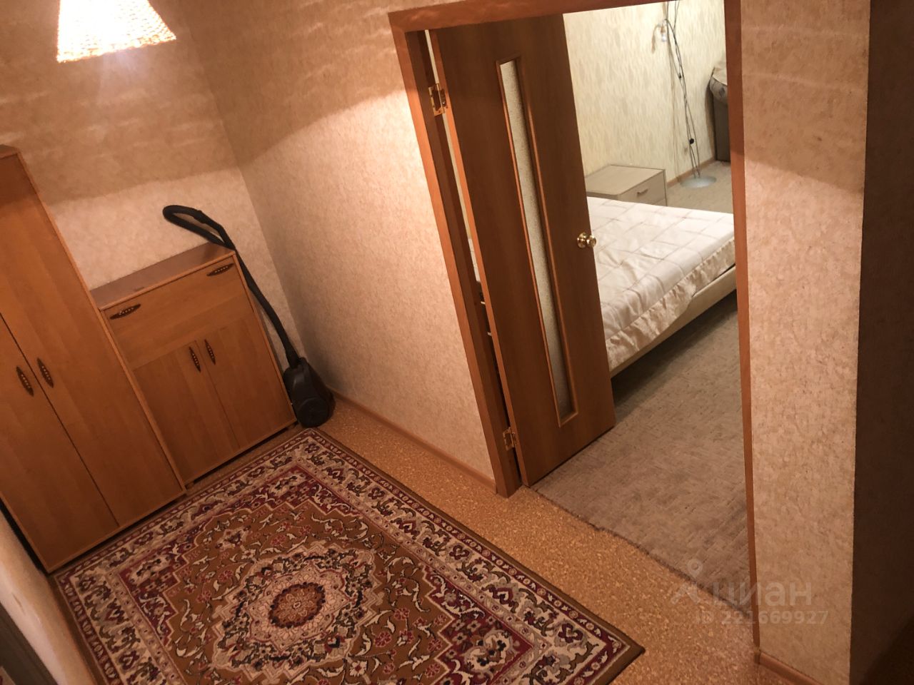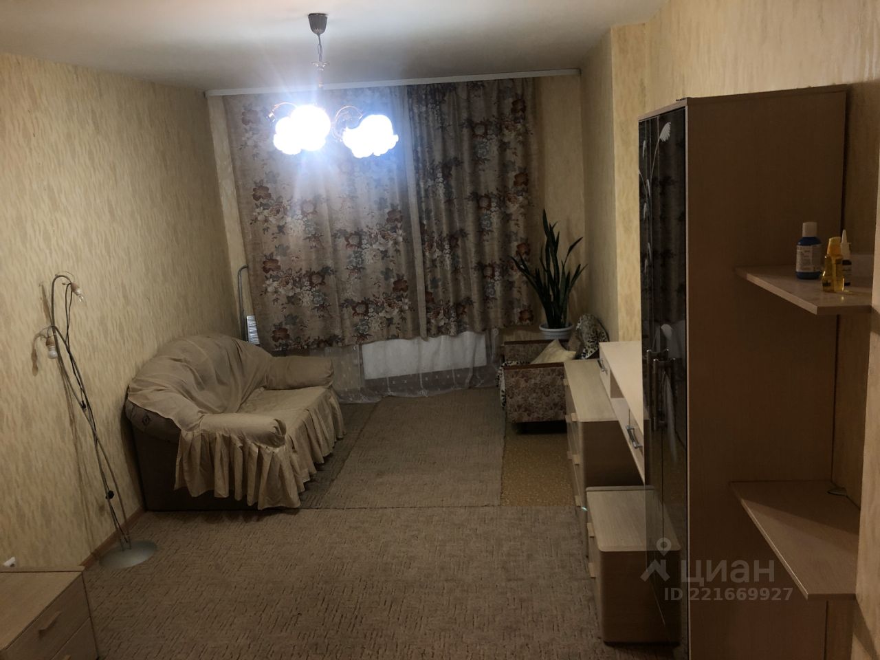 В комнате стоит двуспальная кровать , стеллаж и комод для личных вещей. Также двухспальный диван, кресло.