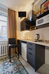 — В кухне СВЧ-печь, Холодильник, электрическая плита, чайник. А также необходимая посуда для приготовления пищи