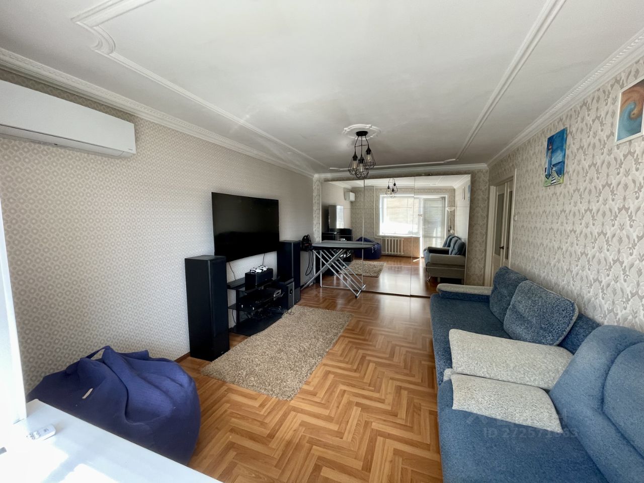 Гостиная: большой раскладной двуспальный диван, кресло + кресломешок, *ТВ 65"** и саундбар, зеркальный шкафкупе, жалюзи от солнца, кондиционер (новый, заправлен).