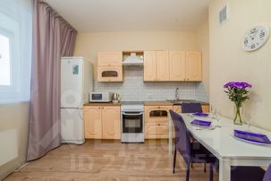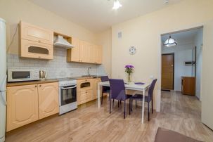 Апартаменты обставлен со вкусом новой современной мебелью в светлых тонах с яркими акцентами в кухонной и ванной зоне.
