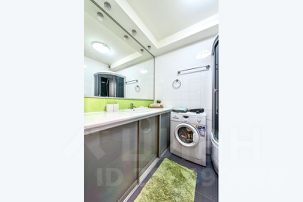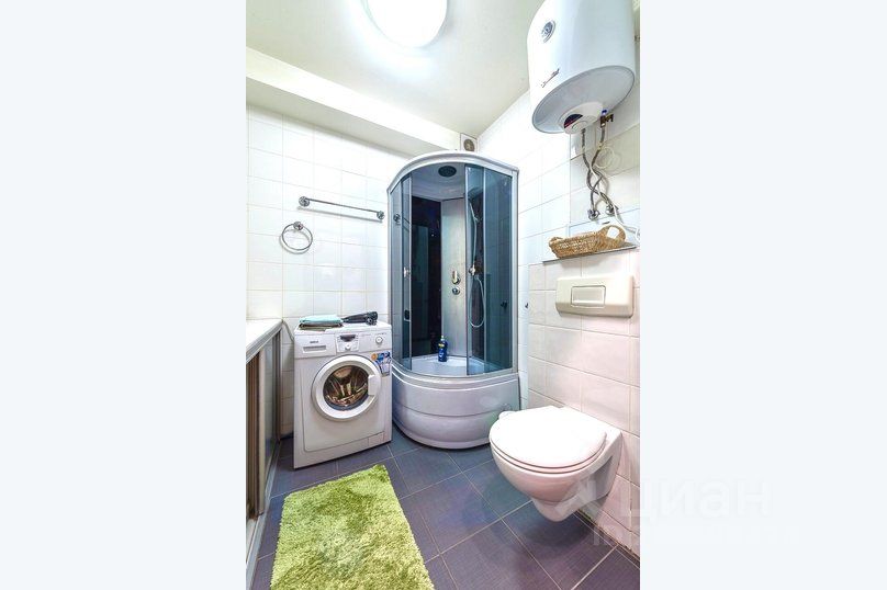 Ванная комната оборудована огромным зеркалом, душевой кабиной, раковиной, унитазом и стиральной машиной.