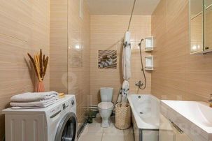 Ванная комната: ванна, стиральная машина, полотенца, утюг, гладильная доска, сушилка, фен, гель для душа, шампунь, мыло, зубная паста.