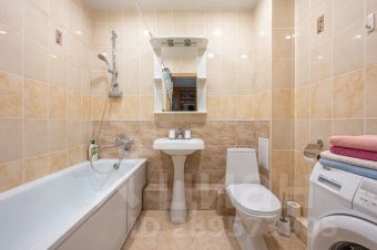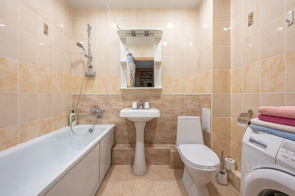 Ванная комната оборудована ванной, раковиной, унитазом, стиральной машиной.