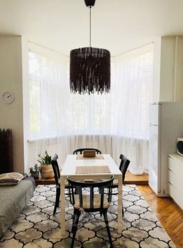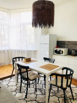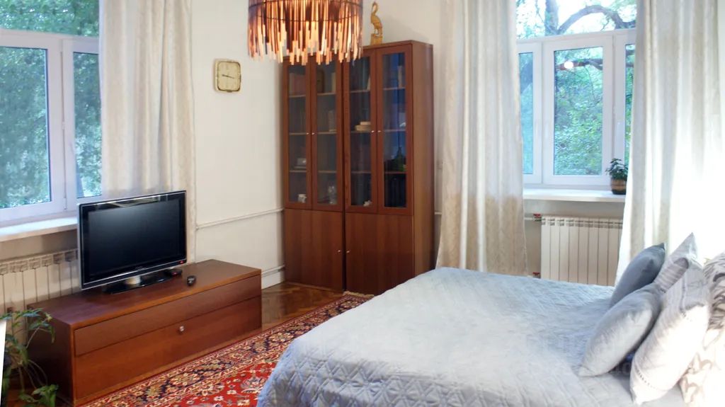 Дизайн квартиры выполнен в стиле СССР, но имеет все необходимое для комфортного проживания: технику, удобные спальные места, красивый вид из окна на тихий зеленый двор.