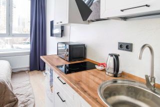 Кухня, оборудованная всей необходимой бытовой техникой и посудой.
