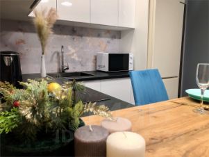 * Полноценная кухня (плита, духовка, микроволновка, чайник)