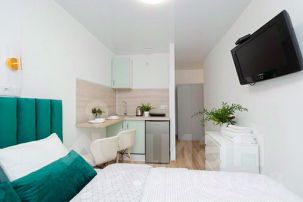 Оснащение: двуспальная кровать, плита, мини-холодильник, чайник, набор посуды, телевизор, фен, утюг, гладильная доска, стиральная машина, душевая кабина, бесплатный высокоскоростной Wi-Fi и кабельное ТV. Для каждого гостя предусмотрено чистое постельное белье, полотенца, туалетные принадлежности, чай, кофе, сахар.