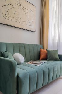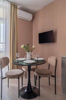 В спальне двуспальная кровать и диван на кухне. Для комфортного проживания квартире есть кондиционер, чистая фильтрованная питьевая вода, вся необходимая техника и посуда.