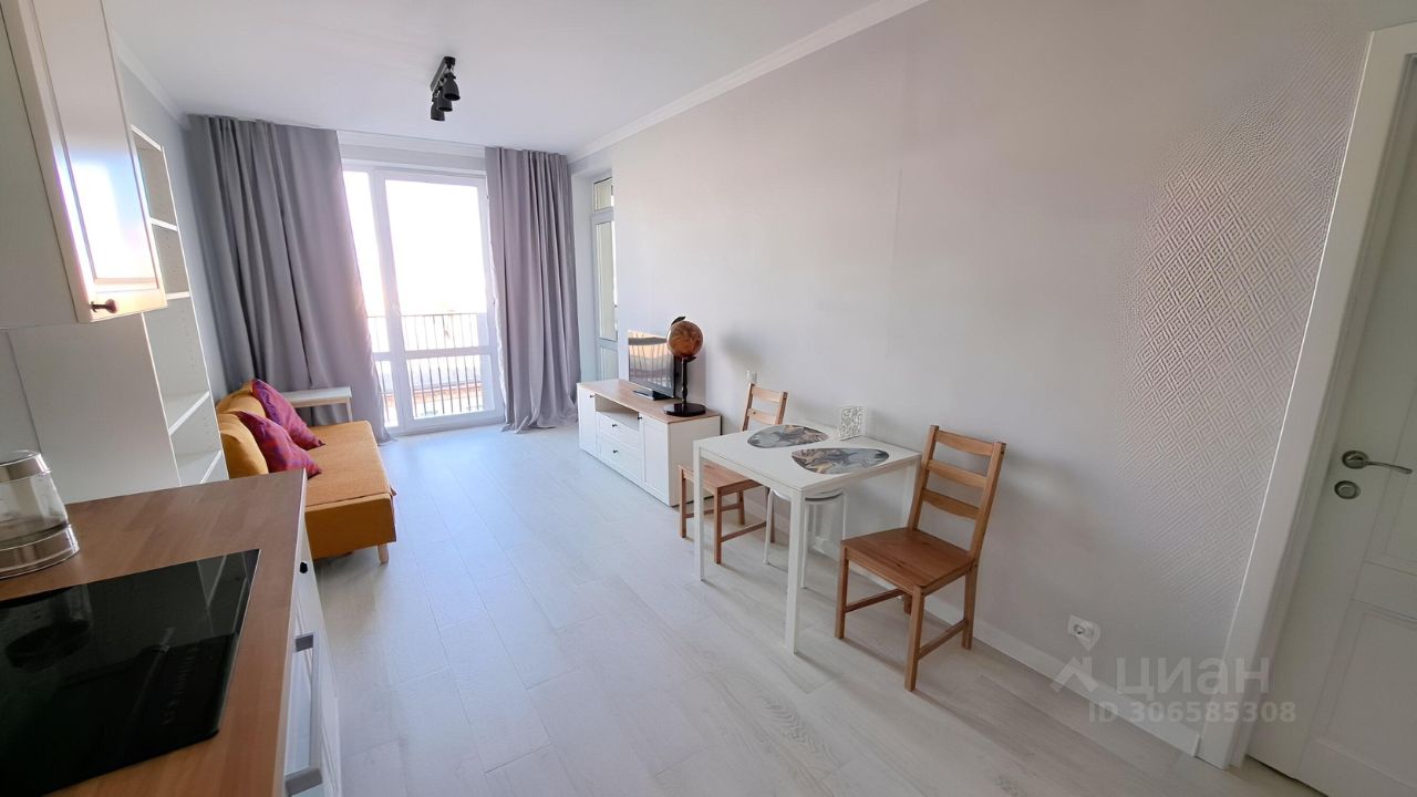В пространстве гостиной особый уют создаёт панорамное окно с французским балконом. Диван раскладывается - можно комфортно устроиться за просмотром кино на телевизоре с функцией SMART-TV.