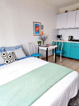 Студия оборудована всей необходимой техникой( плита индукционнаят смарт- телевизор, холодильник, микроволновка, чайник, стиральная машинка, фен, утюг, гладильная доска, сушилка для белья)