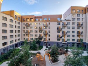 Закрытая территория с охраной, концепция двор без машин гарантирует чистоту и безопасность для детей во дворе.