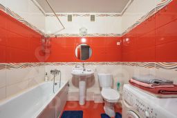 Ванная комната оборудована ванной, раковиной, унитазом, стиральной машиной.