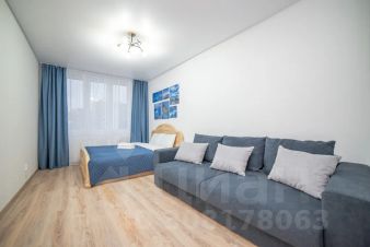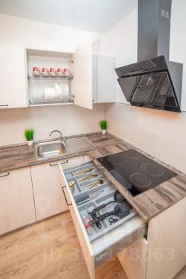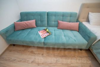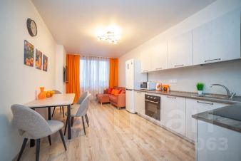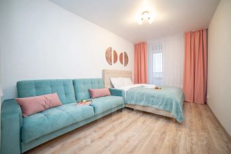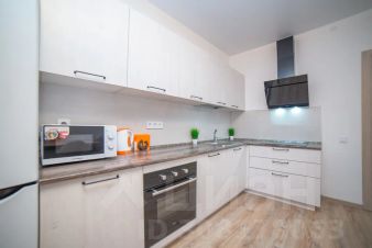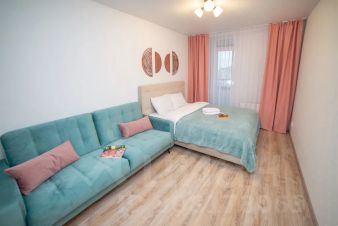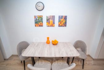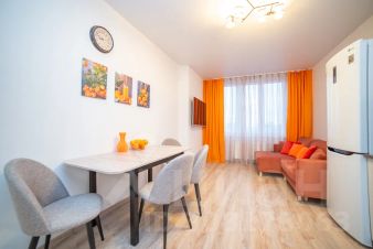 Апартаменты обставлен со вкусом новой современной мебелью в светлых тонах с яркими акцентами в кухонной и ванной зоне.