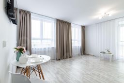 Апартаменты подойдут для размещения 8 человек. Спальные места: 1 двуспальная кровать, 3 раскладных дивана. Имеется все необходимое для комфорта: WI-FI и TV, стиральная машина, фен, утюг. На кухне: плита, холодильник, чайник, микроволновая печь, посуда и столовые приборы. Постельное белье и полотенца предоставляются.