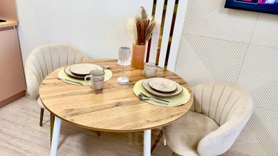 Удобная обеденная и кухонная зона с набором посуды, плитой, микроволновой печью;