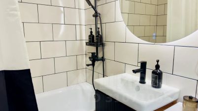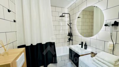 Просторная ванная, фен, полотенца.