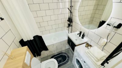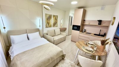 Cовpeменная мебель, посуда, бытовая техника. Заправленное постельное белье, полотенца, одноразовые губки, тряпочки. На кухне есть вся необходимая посуда для приготовления пищи.