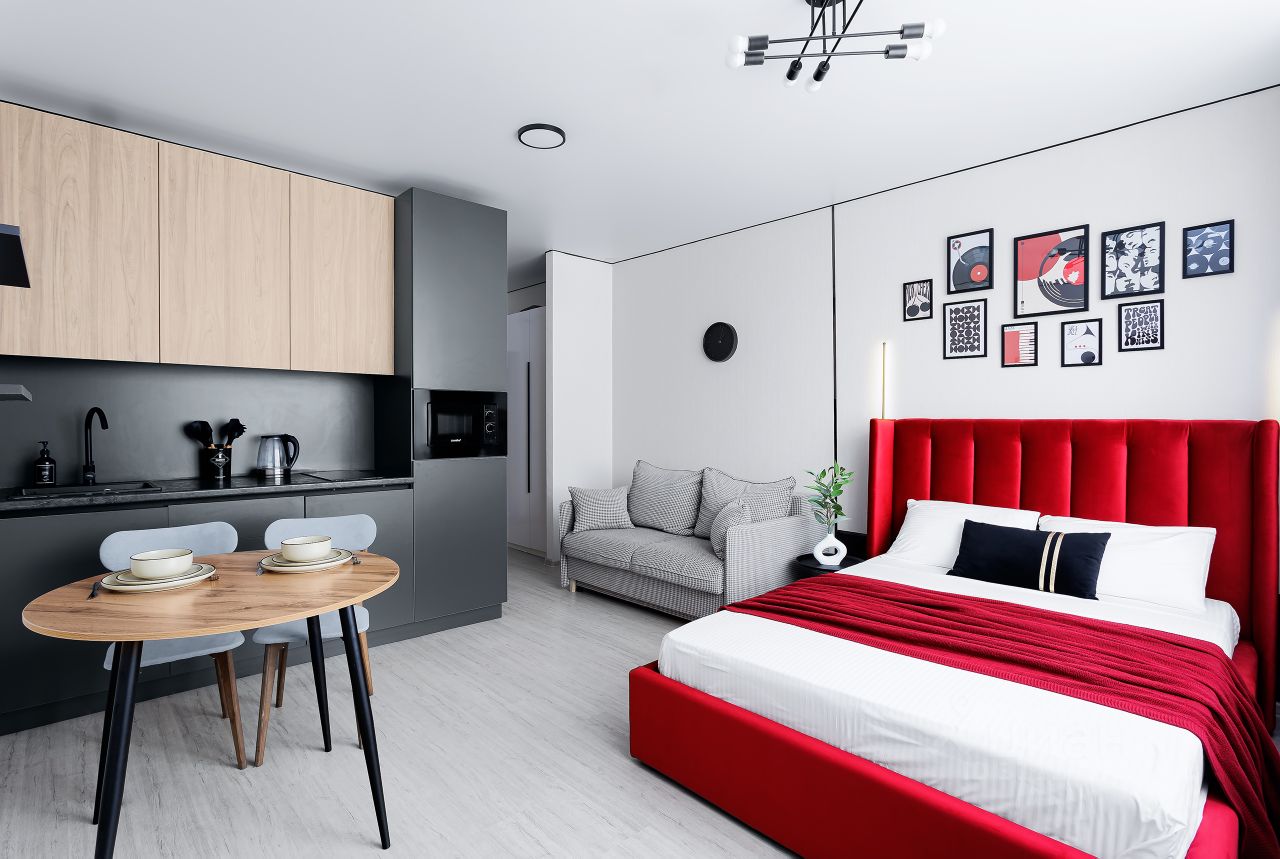 Cовpeменная мебель, посуда, бытовая техника. Заправленное постельное белье, полотенца, одноразовые губки, тряпочки. На кухне есть вся необходимая посуда для приготовления пищи.