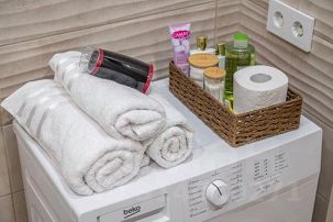 Полноценная ванная, стиральная машинка, гладильная доска, утюг, фен - наслаждайтесь приятными мелочами вдали от дома . Гигиенические принадлежности: тапочки, ароматный гель для душа, шампунь и зубные щетки — всё включено для вашего удобства .