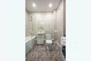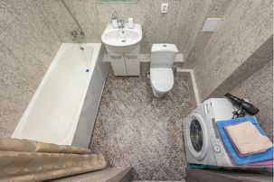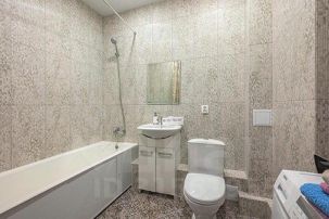 Ванная комната оборудована ванной, раковиной, унитазом, стиральной машиной.