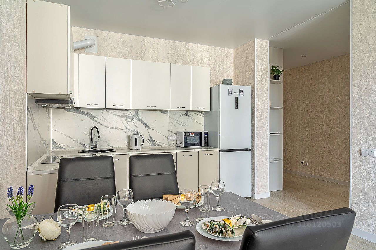 Кухня: электрическая плита, СВЧ печь, холодильник, чайник, вытяжка, фильтр для воды, набор посуды.