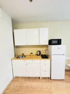 Кухня: холодильник, варочная панель, электрический чайник, а также весь необходимый комплект посуды и столовых приборов
