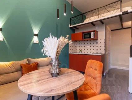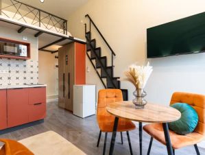 Вам доступна гостиная зона с кухней и раскладным диваном, который обеспечивает дополнительные спальные места.