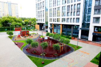 через дорогу уютный городской парк с кафе и спортивными площадками