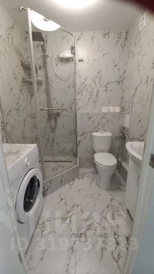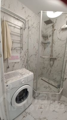 Ванная облицована полностью плиткой из керамогранита, установлена душевая кабина, стиральная машина, электро-полотенцесушитель, умывальник с тумбой, гигиенический душ.