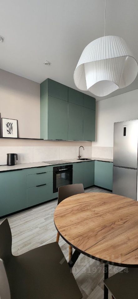 В квартире есть всё необходимое для комфортного проживания. На кухне установлены современная мебель и техника: холодильник, посудомоечная машина, индукционная плита, духовка, чайник и микроволновка.