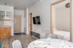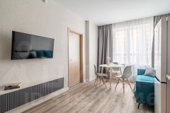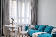 - вся необходимая мебель для проживания: изолированная комната с двуспальной кроватью, места для хранения вещей, комфортный диван и обеденная зона
