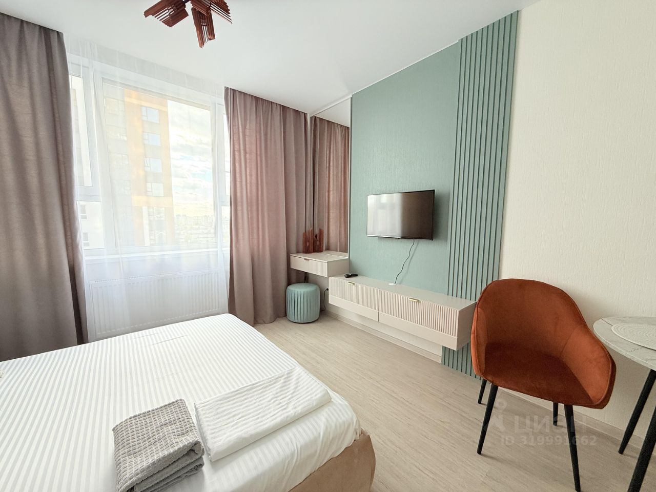 просторная спальная зона с комфортной двуспальной кроватью и мягкими подушками;