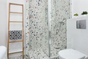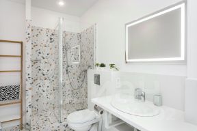 Большой совмещенный санузел с траповым душем и зеркалом с подсветкой.
