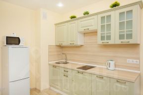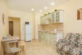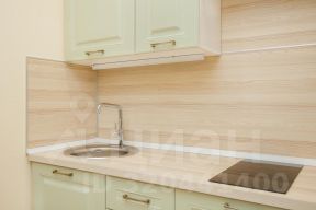 Полноценная кухонная зона, с холодильником, варочной панелью и обеденной зоной.