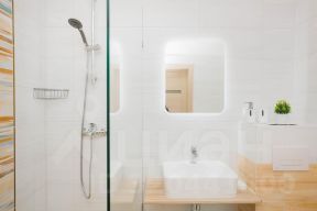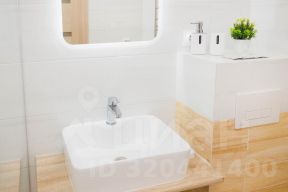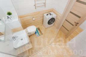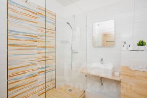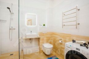 Санузел совмещенный с теплым полом, стены и пол которого выложены плиткой. Траповый душ, стиральная машина и большое зеркало с подсветкой у раковины.
