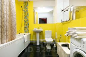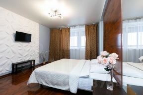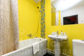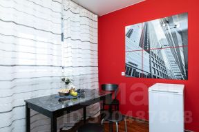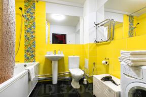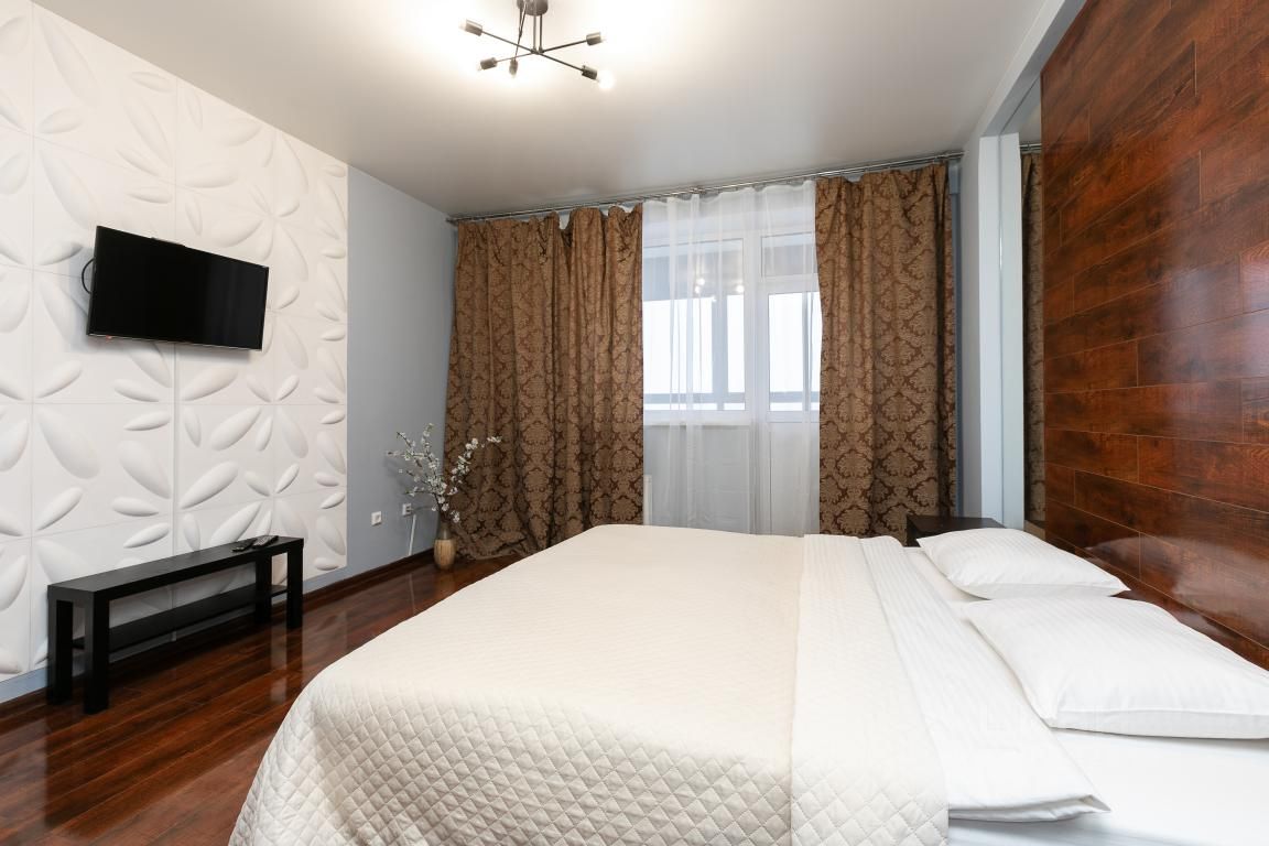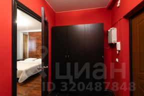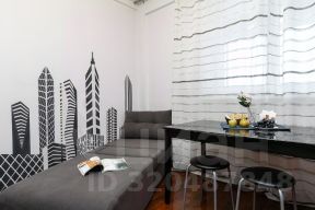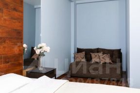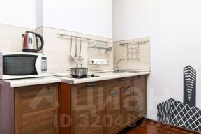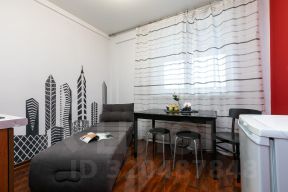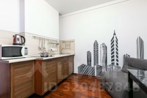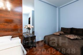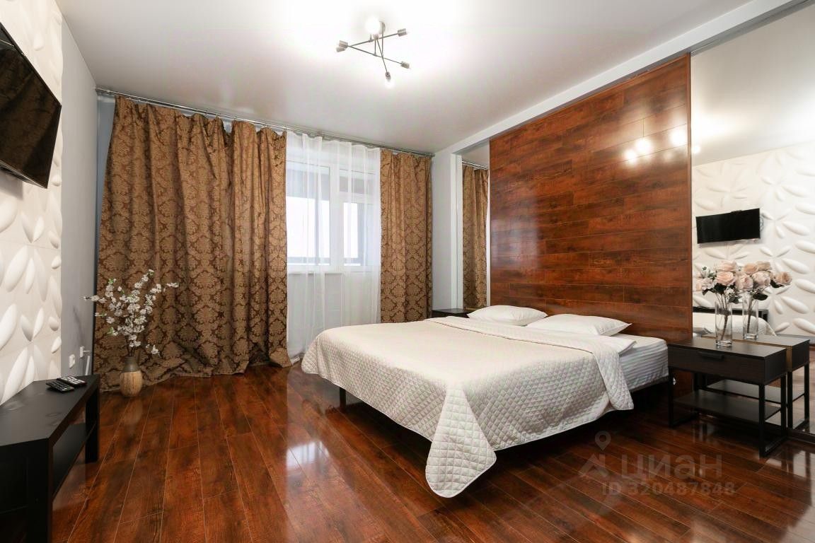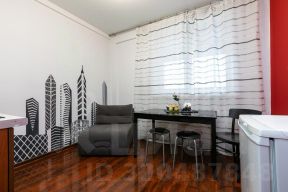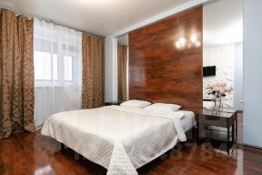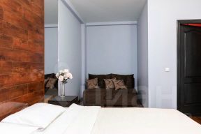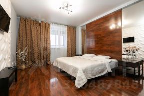 Стильная однокомнатная квартира в ЖК "Александровский квартал" с нестандартным дизайнерским оформлением - комбинация зеркальных поверхностей с деревянными панелями. В комнате установлена двуспальная кровать-бокс и диван-кровать. Еще одно кресло-кровать есть на кухне.