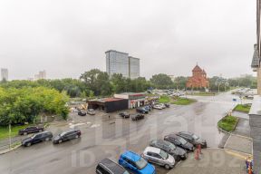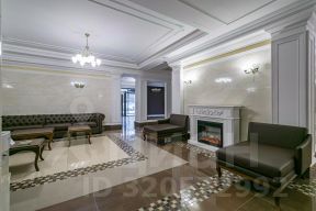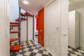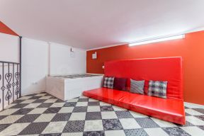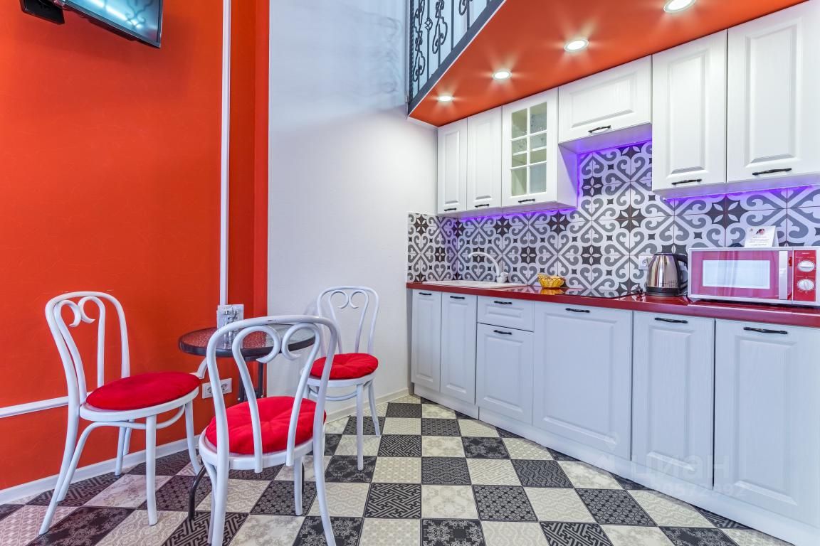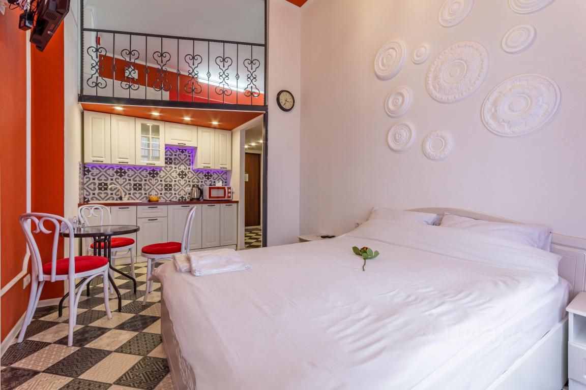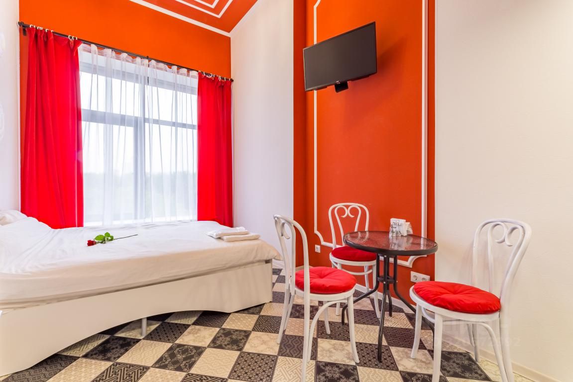 Алый номер с высокими потолками и лепниной на стенах. На первом этаже - большая цельная двуспальная кровать, кухонная зона и совмещенный санузел с душем и теплым полом. На полу - шахматная плитка.